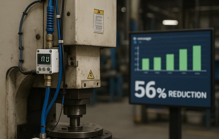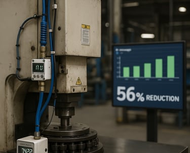 El estudio presenta una estrategia IIoT para modernizar una Turret Punch Press (TPP) de Mitsubishi Electric con el fin de reducir su huella energética y de aire comprimido. Se instalaron sensores KEYENCE MP-F para registrar en tiempo real caudal, presión y consumo eléctrico, comunicados vía Modbus TCP/IP a un tablero interactivo. El análisis reveló ineficiencias clave: la máquina permanecía en stand-by gran parte del día y existía una fuga continua de aire. Al capacitar a los operadores para apagar la TPP durante inactividad y añadir una válvula inteligente que cierra el suministro cuando la potencia cae por debajo de 1 kW, el consumo eléctrico bajó 56 % y el de aire 83 %. Además, los datos alimentan alertas tempranas y comparativas mensuales, facilitando la planificación de mantenimiento y la priorización de futuras inversiones. El enfoque demuestra cómo el retrofit digital de equipos legados puede generar ahorros rápidos, escalarse a otras máquinas y respaldar objetivos de sostenibilidad corporativa.